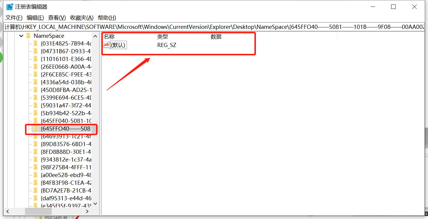 此时左侧会出现一个命名为“新建#1”的文件夹,将其重命名为“{645FFO40——5081——101B——9F08——00AA002F954E}”,然后我们将看到有一个默认项出现在右边。