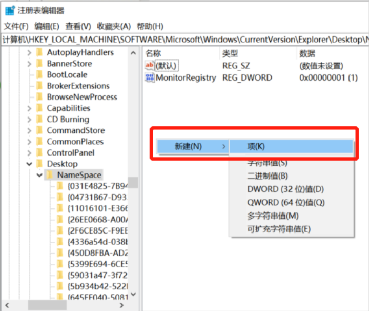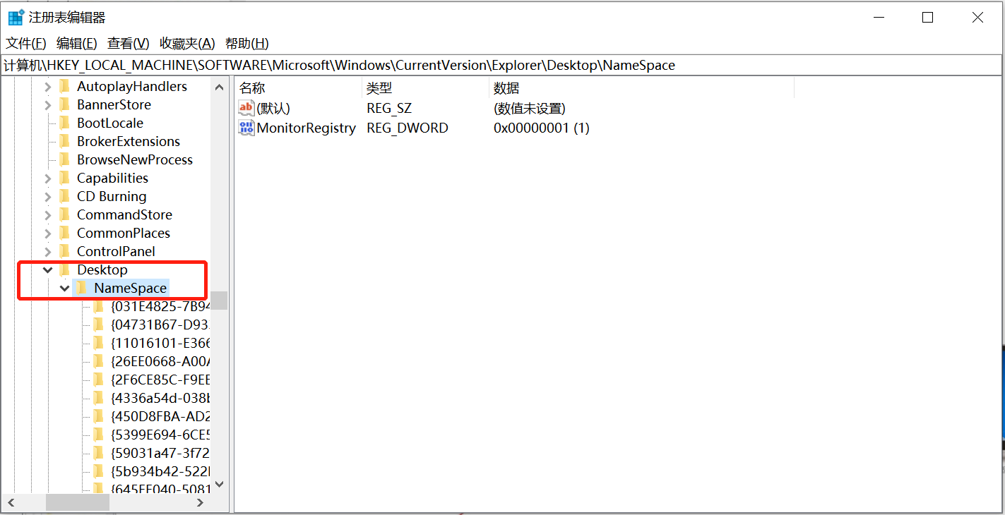 进入注册表页面后,依次打开注册表中的“ HKEY_LOCAL_MACHINE”-“SOFTWARE”-“Microsoft”-“Windows”-“CurrentVersion”-“Explorer”-“DeskTop”-“ NameSpace”。