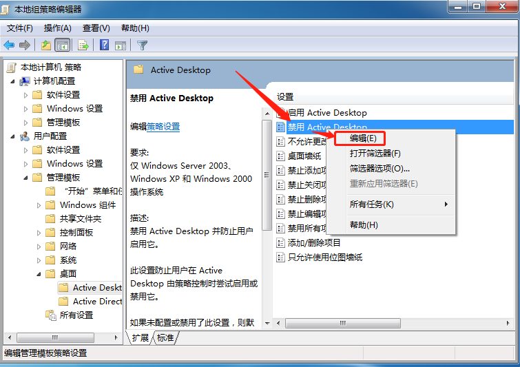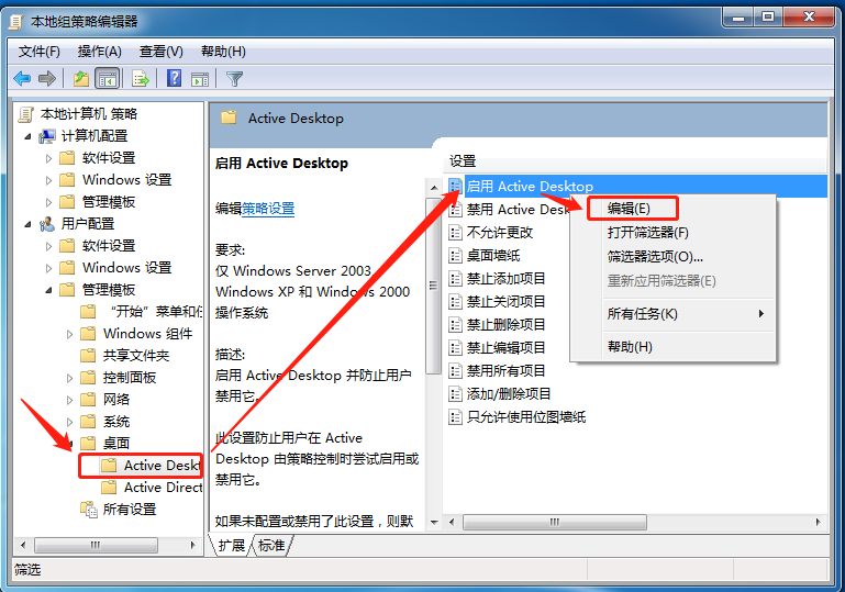 再选择桌面下的“Active Desktop”,右键点击右侧的“启用Active Desktop”,选择“编辑”。