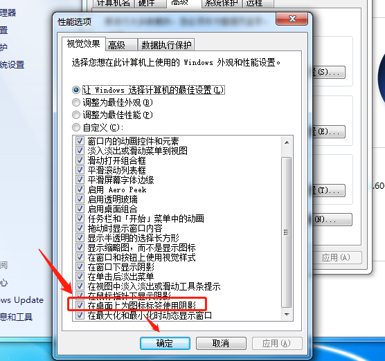 在视觉效果中下拉找到并勾选“在桌面上为图标标签使用阴影”,最后点击下方应用和确定即可。
