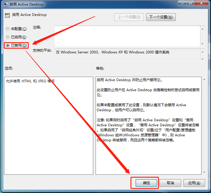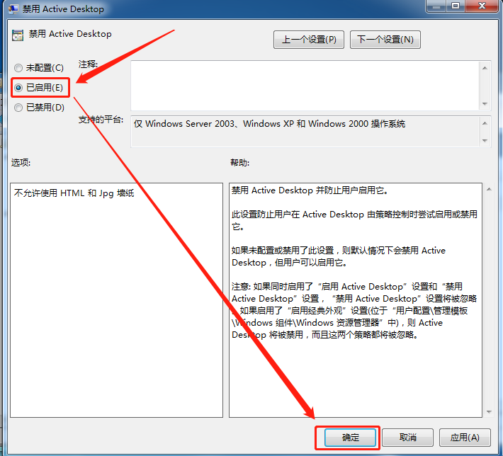 回到组策略编辑器页面,相同步骤进入“禁用Active Desktop”的编辑页,选中“已启用”后点击确定。