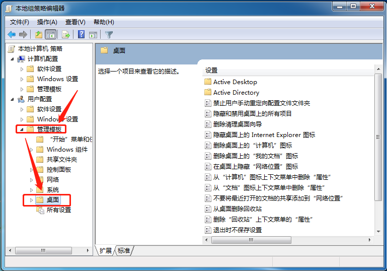 在打开的组策略编辑器页中选择“管理模板”下的“桌面”。