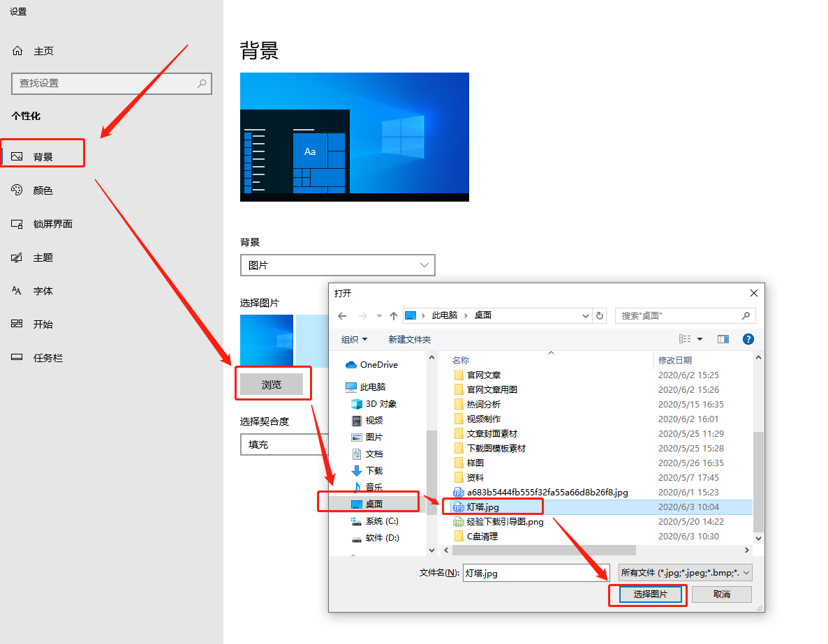 在弹出的设置页面的背景中,点击“浏览”按钮找到并选择刚刚放在桌面的壁纸。