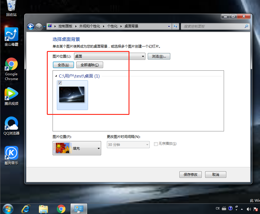 然后点击图片位置的“浏览”按钮,选择我们壁纸的存放位置,点击确认即可。
