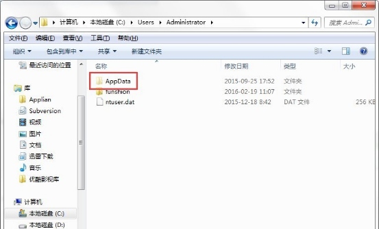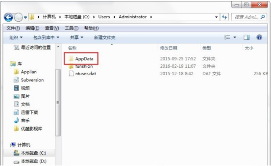 5、打开AppData文件夹(系统文件被隐藏,可能会看不见);
