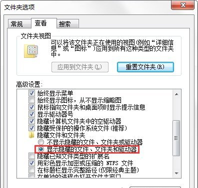 2、文件夹选项→查看→去掉【隐藏受保护的操作系统文件】前的对勾,再选中【隐藏文件和文件夹】→【显示所有文件和文件夹】→确定。