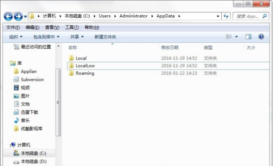 6、打开AppData文件夹,里面有三个文件夹Local、LocalLow、Roaming。