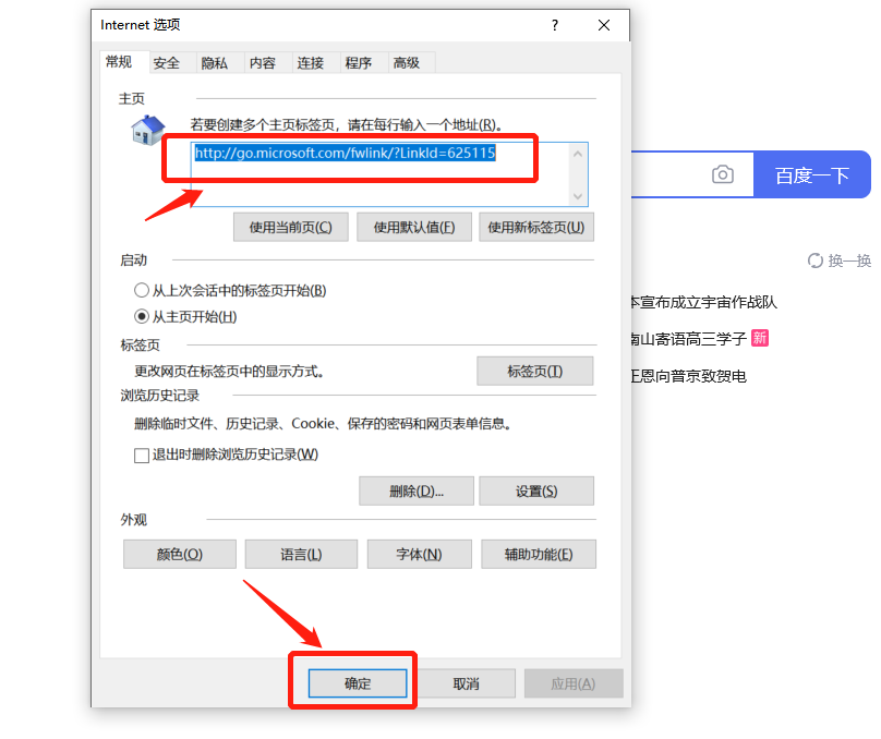 在弹出的internet选项窗口的常规中,将你想要设置成主页的网址输入主页栏内,然后点击下方“确定”。