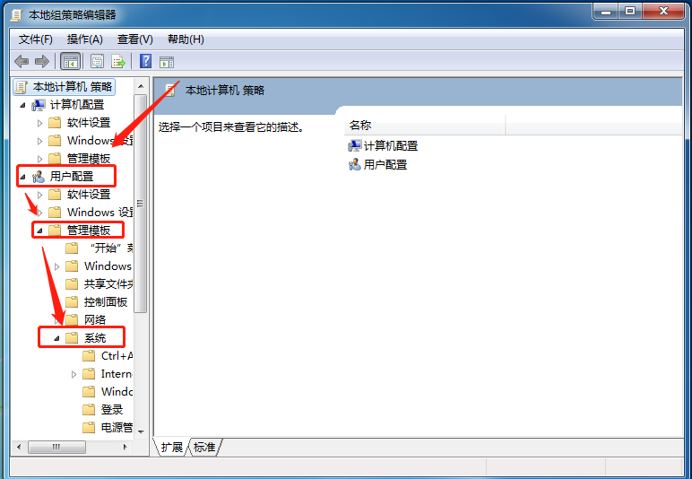 在组策略编辑器窗口中找到并打开“用户配置”,然后找到并打开“管理模板”,再找到并选择“系统”。
