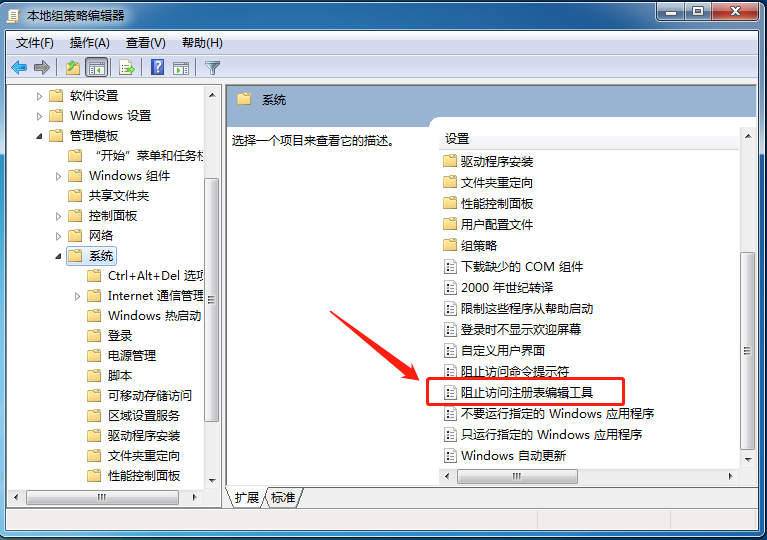 在“系统”的右侧窗口中,下拉找到“阻止访问注册表编辑器”,双击进入。