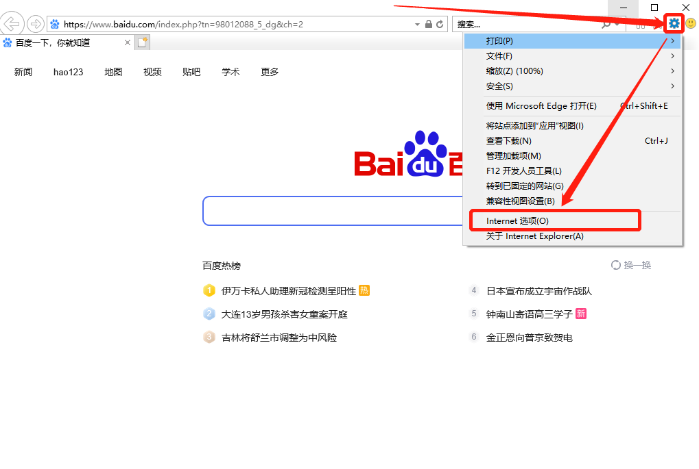 打开浏览器(这里以IE浏览器为例),在页面中找到工具,点击“internet选项”。