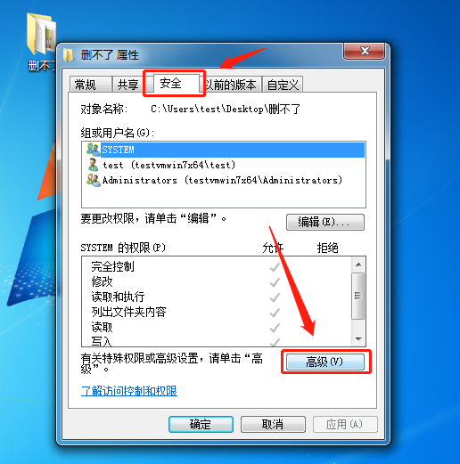 鼠标右击无法删除的文件,选择“属性”,点击“安全”,找到“高级”打开。