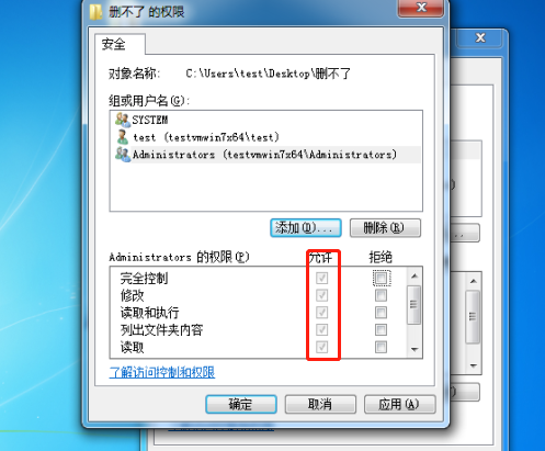 最后回到文件夹的权限页把全部权限勾选上确定即可删除文件。