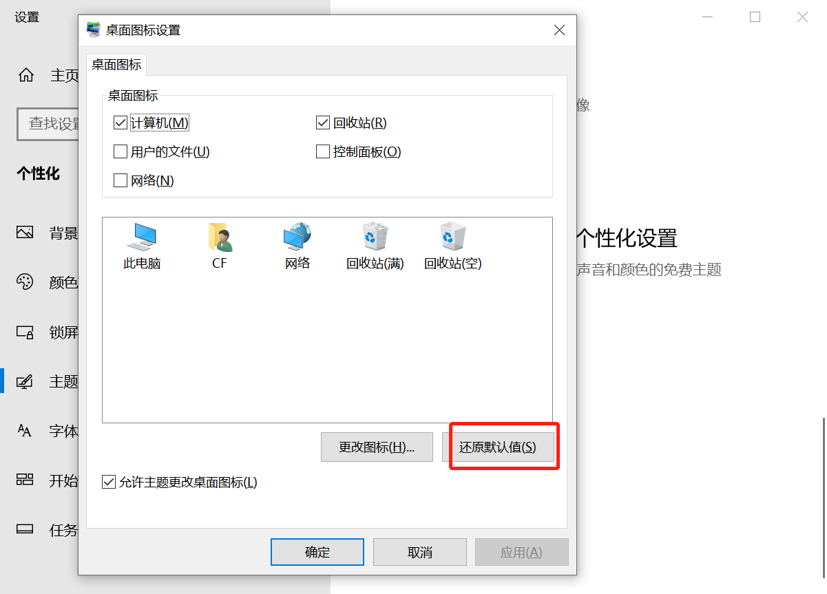 点击进入桌面图标设置页面,点击“还原默认值”。