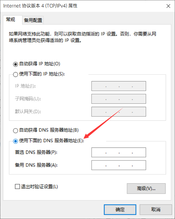 双击“Internet协议版本4”,勾选“使用下面的DNS服务器地址”