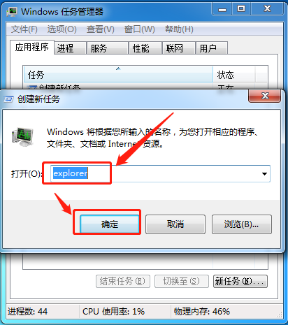 在弹出的任务新建打开选项输入 “explorer” ,最后点击确定即可。