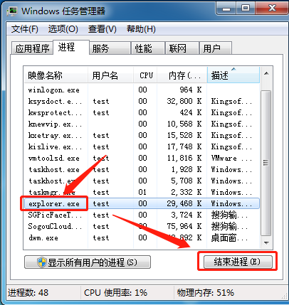 这时我们选中“ explorer ”进程,然后点击下方的“结束进程”。