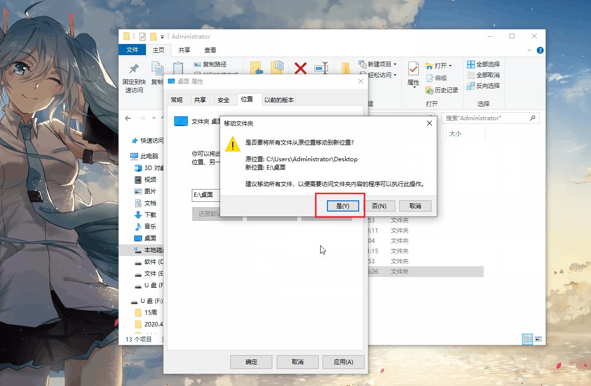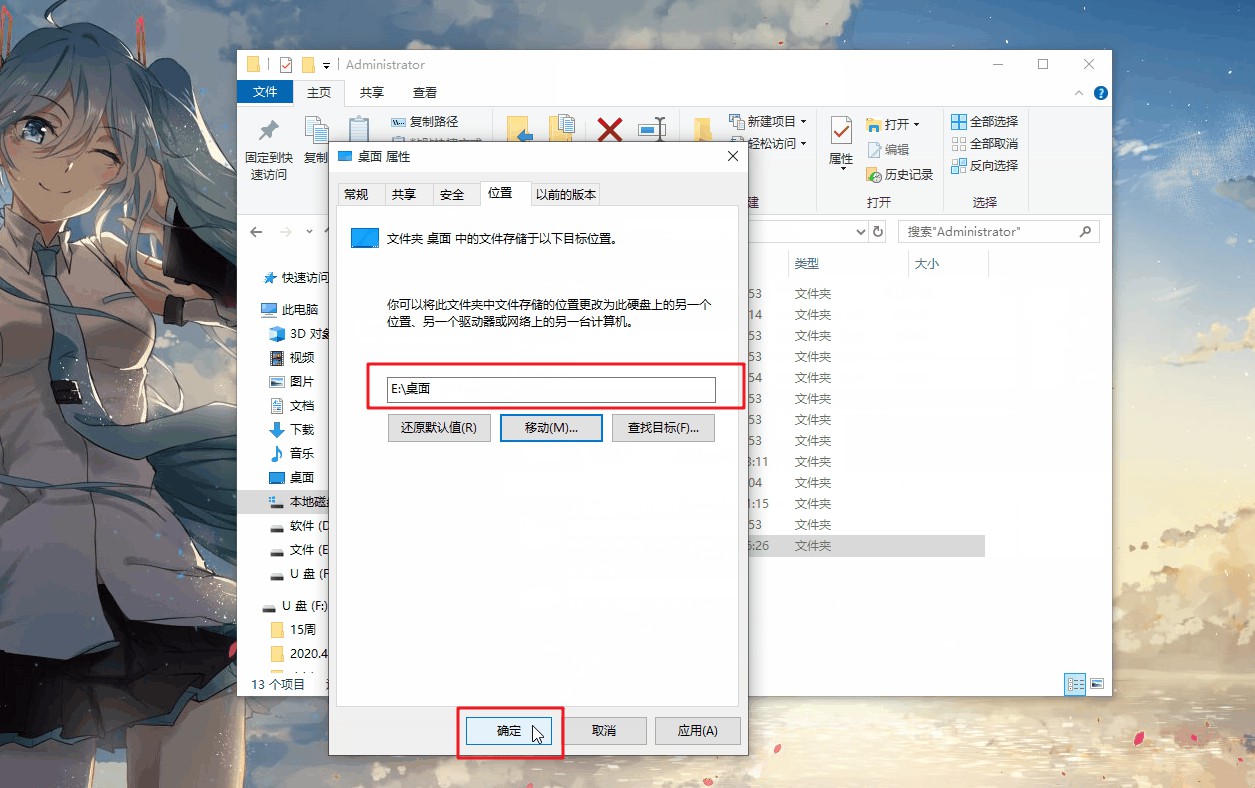 5、 再次确认桌面文件移动位置,点击“确定”