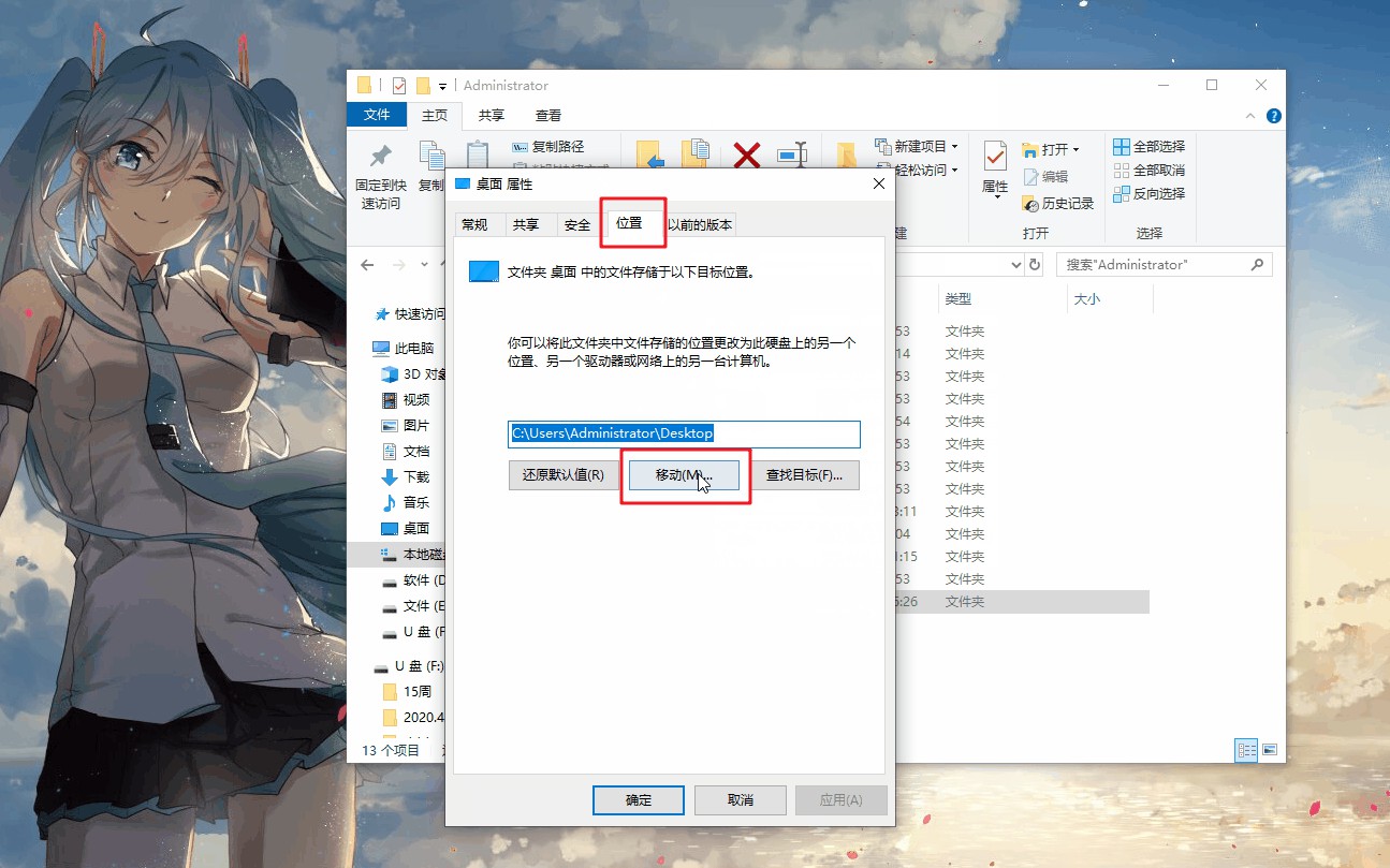 3、 点击“位置”,可以看见桌面文件存储位置,点击“移动”