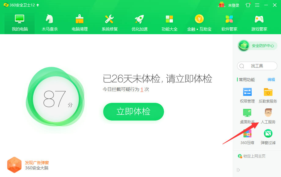 2.如果仍然无法解决问题,我们可以打开360 安全卫士,然后单击“人工服务”。