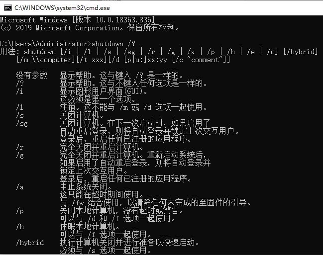 (3)在该界面上,输入shutdown /?然后按Enter键以查看shutdown命令的介绍。