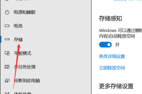 3、在储存界面的右侧,打开存储感知下面的滑动开关,系统就会自动删除不需要的文件。