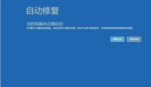 2,出现如图界面,点击“高级选项”进入,然后选择“疑难解答”——>“高级选项”进入命令提示符窗口。