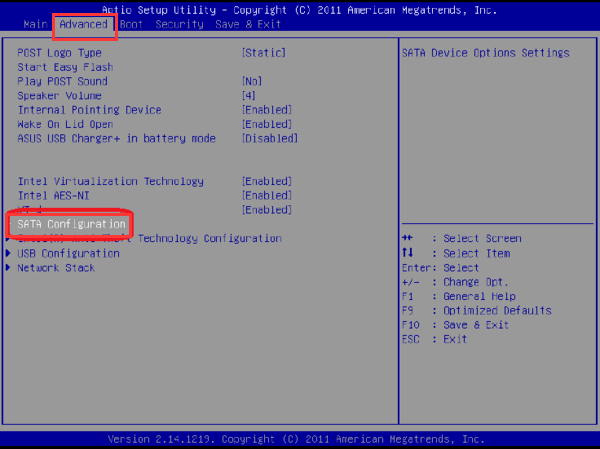 2。电脑进入BIOS后,通过键盘左右键将界面切换到“高级”窗口,找到“SATA配置”输入键。