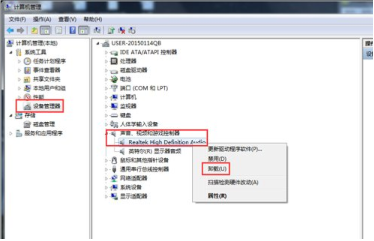 3。然后找到设备管理器、声音、视频和游戏控制器,然后单击卸载。
