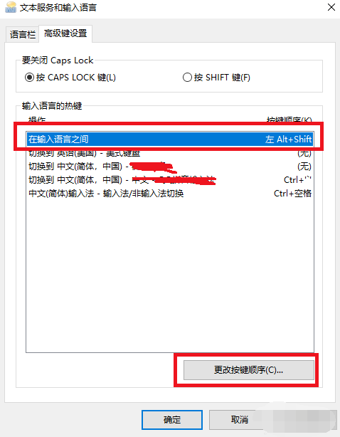 6。此时,我们将看到输入法快捷键设置和多个输入法的切换设置。我们选择第一个输入方法快捷键设置,然后单击下面的更改键序列按钮。