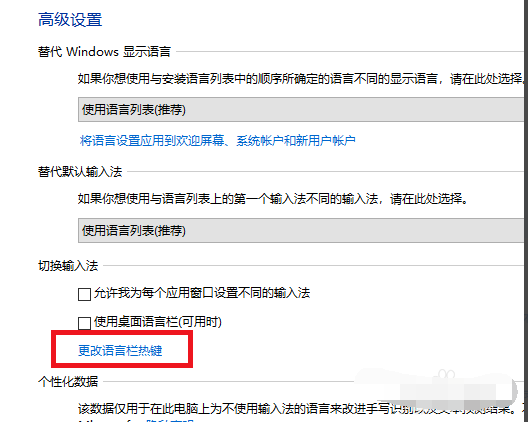 4。然后单击高级设置。在高级设置界面的中间,有一个链接可更改语言栏中的热键。点击它。