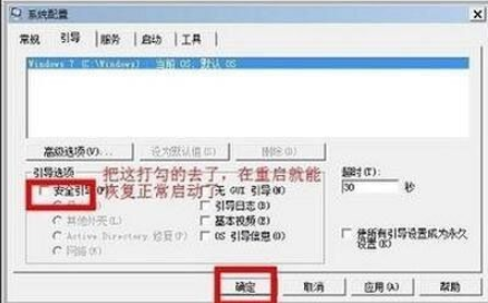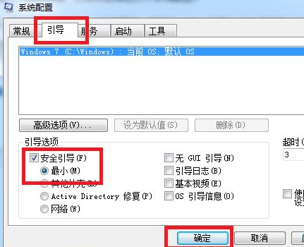 2。弹出“系统配置”窗口,选中“启动”下的“安全启动”,单击“确定”,重新启动计算机进入安全模式