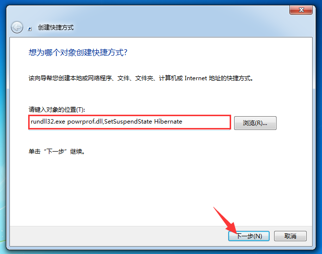 2。然后在对象位置输入[rundll32.exe powrprof.dll,setsuspended state hibernate],然后单击[下一步]。