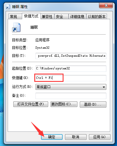 5。然后在快捷键位置输入快捷键。这里设置的快捷键是Ctrl F1,只要与系统快捷键没有冲突。然后按快捷键[Ctrl F1]立即进入睡眠状态。也可以直接双击“睡眠”快捷方式。