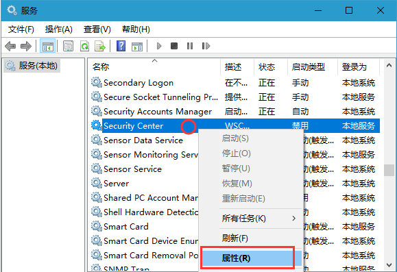 2、打开本地服务后,在服务中找到 Security Center 双击打开。