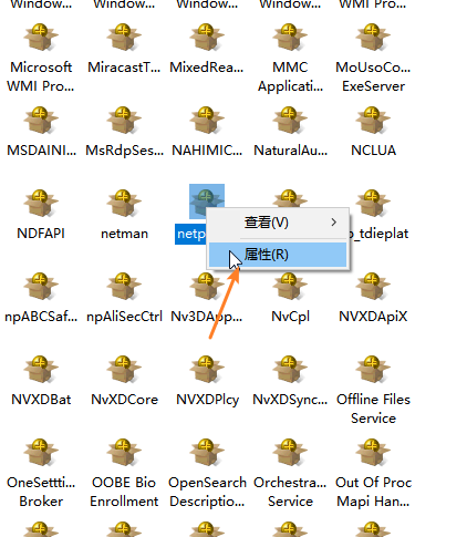 3.在右侧找到“ netprofm”,单击鼠标右键,然后单击“属性”;