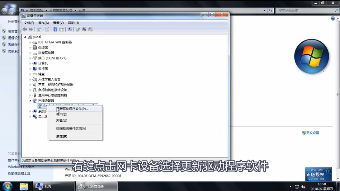 4、右键点击网卡设备,然后选择【更新驱动程序软件】即可。