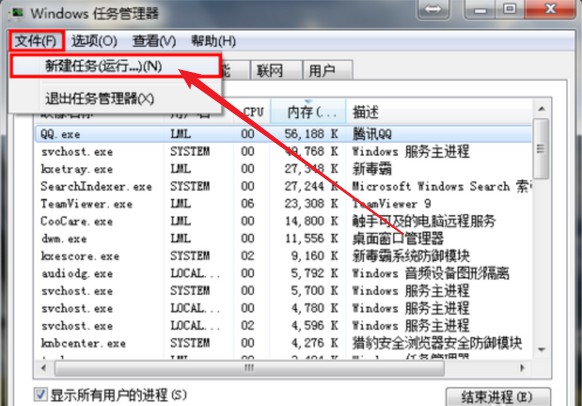 2、调出任务管理器后,点击“文件”-“新建任务(运行)”