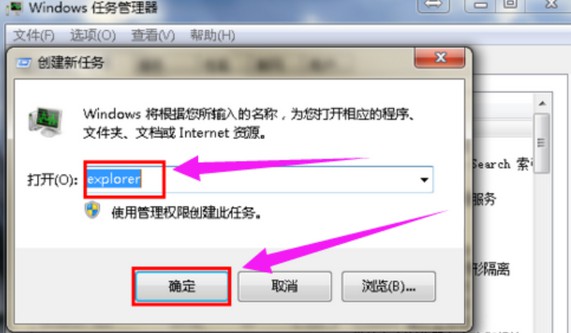 3、在打开的运行窗口中,输入“explorer”或者“explorer.exe”点击确定即可(这是桌面进程,控制桌面所有图标和任务栏的显示)