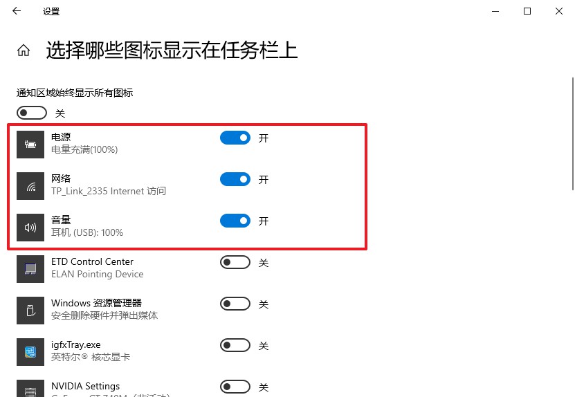 4、所以,我们只要将不见了的图标设置为“开启”就可以了,设置好之后,在系统右下角就可以看到不见了的图标(音量、网络、电源图标)出现了