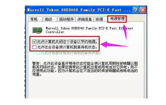 3、 之后,点击切换到“电源管理”选项卡,确保勾选“允许计算机关闭这个设备以节约电源”复选框,取消勾选“允许这台设备使计算机脱离待机状态”复选框,操作完成后单击“确定”即可