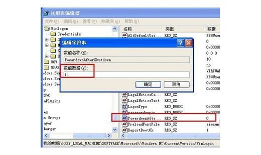 3、 然后,找到并双击打开 “PowerdownAfterShutdown”的字符串键值,将数值数据修改为“1”,设置完成后,点击“确定”即可