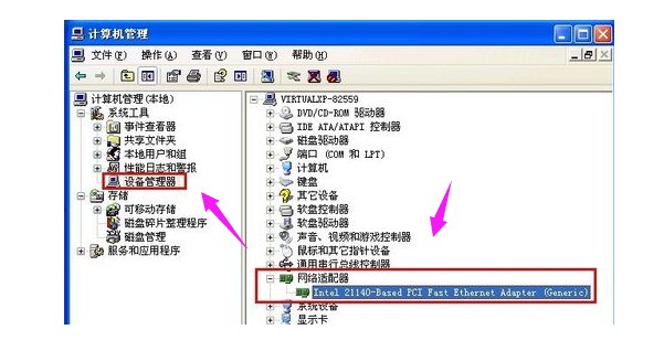 2、 然后,左侧点击“设备管理器”项,在右边窗口点击展开“网络适配器”,双击打开网卡