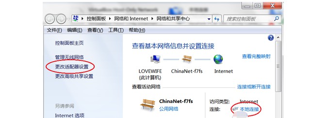 6、 在打开的“打开网络和共享中心”页面中,可以看到目前只有“本地连接”,这是有线的。我们再点击左上角的“更改适配器设置”