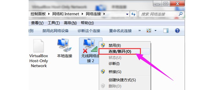 7、 在打开的“网络连接”窗口中,右击刚刚安装的无线,选择“连接/断开”命令