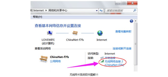 11、 我们重新打开“打开网络和共享中心”,就可以看到电脑已经有无线网络连接了,并显示我们已经连接的无线网络