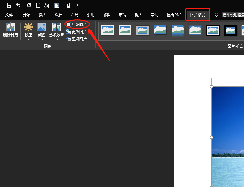 第五步插入图片后,上方菜单工具栏中会出现“图片格式”选项,在菜单栏中点击“压缩图片”选项。