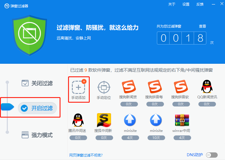 第三步我们找到弹窗过滤后点击进入,进入后我们点击“开启过滤”,系统会帮我们进行过滤弹窗,我们也可以进行手动进行添加需要过滤弹窗的软件。