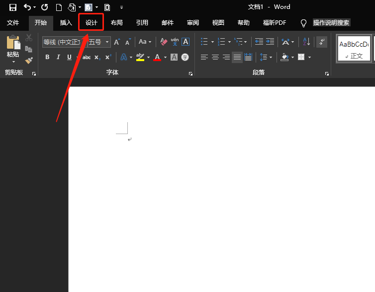 我们初始的文档页面颜色默认都是白色的,下面我们进行操作更改页面背景颜色,我们使用鼠标点击word上方菜单工具栏中的“设计”选项按钮。