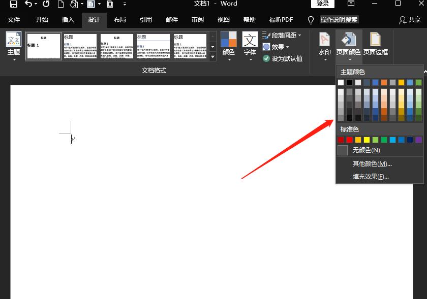 我们点击“页面颜色”选项按钮后会出现一个下拉窗口,在窗口中我们可以进行选择页面的颜色。